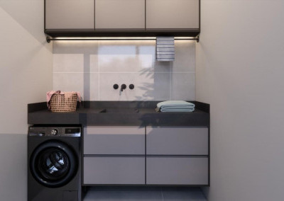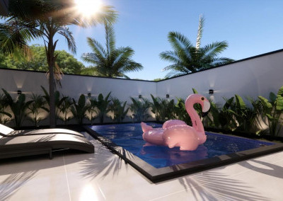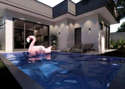 - Lavanderia, banheiro externo e piscina.